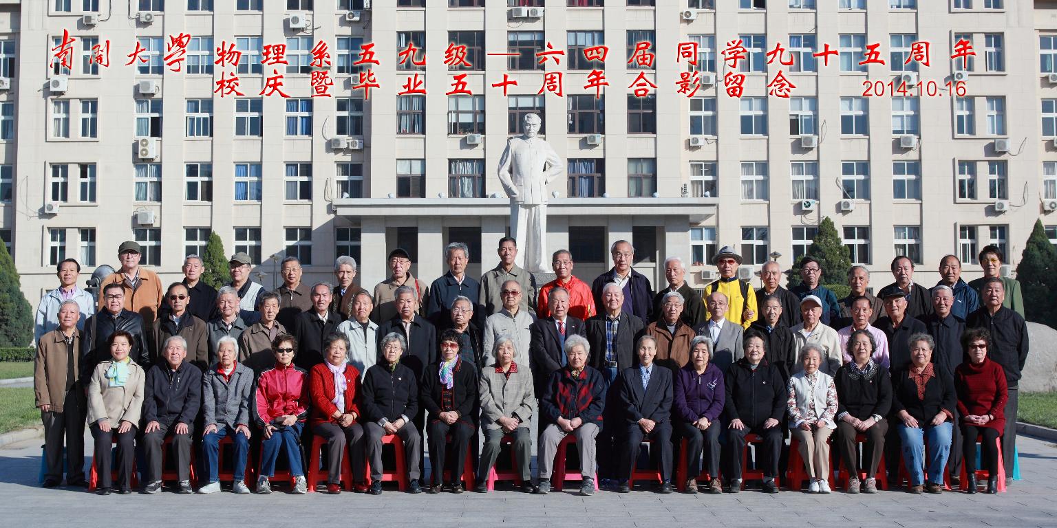 2014年10月15日天高云淡、秋风送爽。母校南开大学热情欢迎着来自四面八方的南开校友。为了欢庆95周年校庆暨毕业50周年的物理系59级—64届的老校友们,虽然不少人满头白发、满脸沧桑,已经70多岁,但个个神采奕奕,急切地向着明珠园大厅的报到处走去。大厅内洋溢着老同学们相聚的欢声笑语,握手、拥抱,彼此有说不完的问候和知心话,如同又重新回到了五十年前的大学时代。