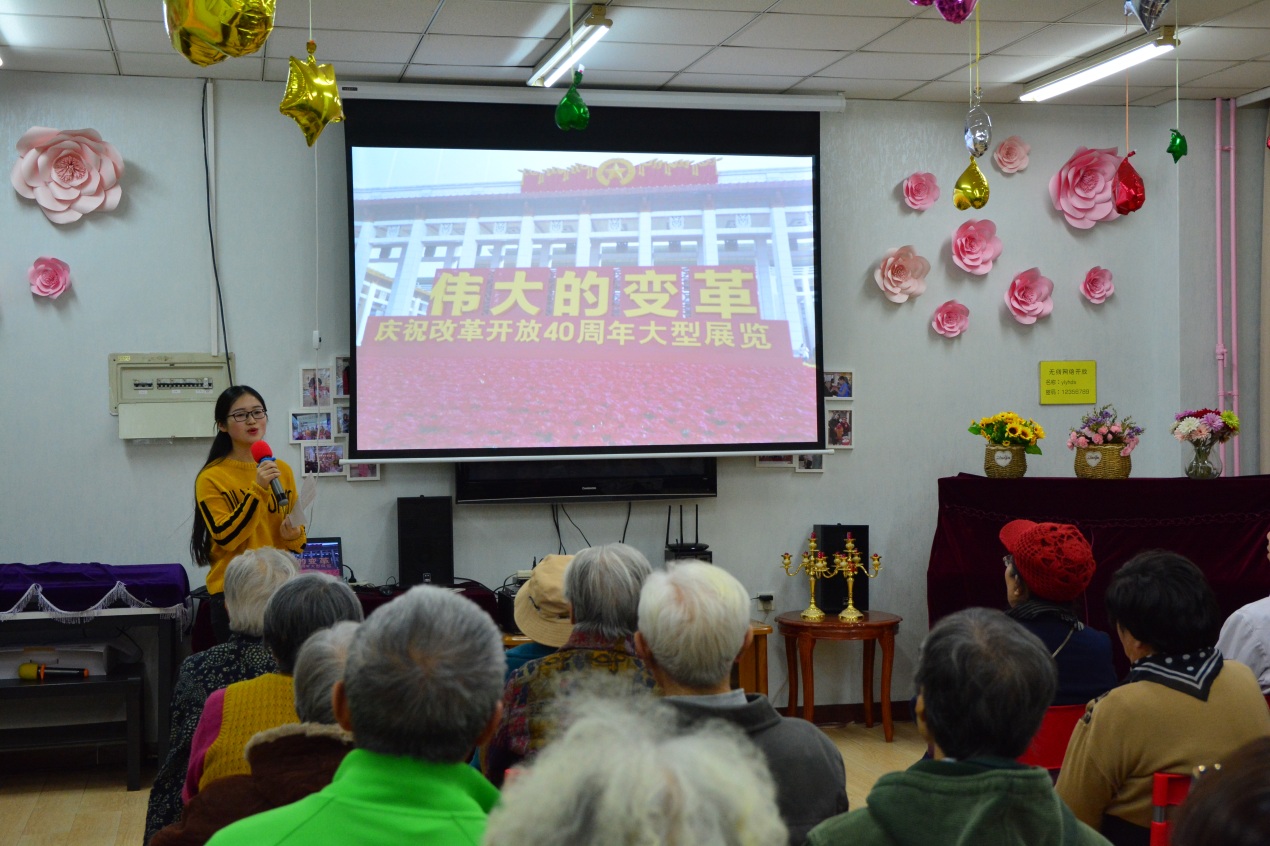 11月24日,学院党校组织全体学员赴北京国家博物馆参观了“伟大的变革——庆祝改革开放四十周年大型展”,我支部与老人党员支部讨论借此机会带回来展览的照片影视资料并在养老院开展关于改革开放的对谈会。2018年11月30日下午,我支部与养老院合作的首次活动“关于改革开放四十周年宣讲对谈会”圆满开展。