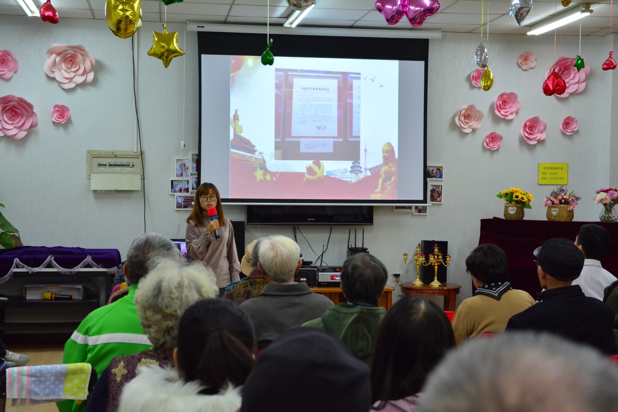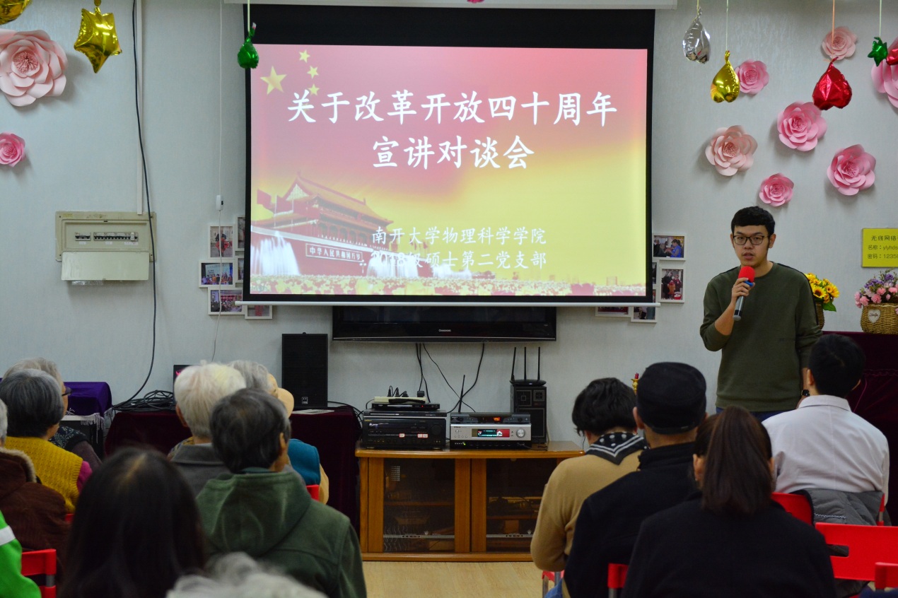 支部书记王艺驰说:“今年是改革开放四十周年,这是一个巧妙的时间将在坐的爷爷奶奶党员们跟我们年轻党员联系起来,四十年前爷爷奶奶们也就差不多我们这个年纪,站在时间轴两个端点的,四十年后的我们接过您们的接力棒,务实前行。”