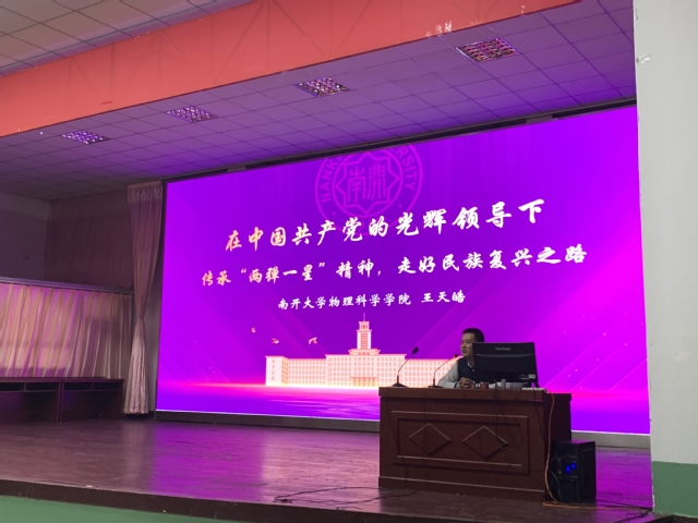 活动中,物理科学学院2018级硕士研究生王天皓以“传承‘两弹一星’精神,走好民族复兴之路”为主题,以习近平总书记视察南开大学重要讲话精神切入,从南开大学杰出校友周恩来总理亲自筹划领导“两弹一星”科研攻关取得伟大胜利的杰出贡献和南开大学杰出校友、“两弹一星”元勋郭永怀烈士以身许国的感人事迹出发,结合上世纪五六十年代的国际形势和广大科技工作者毅然归国、各行业人员协同攻关的壮阔历程,用一段段感人故事和一幕幕振奋画面,生动形象地诠释了以“热爱祖国、无私奉献,自力更生、艰苦奋斗,大力协同、勇于登攀”为内涵的“两弹一星”精神及其时代价值。