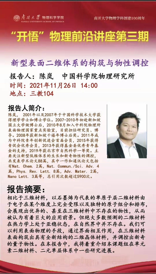 【“开悟”物理前沿讲座(第3 期)】新型表面二维体系的构筑与物性调控