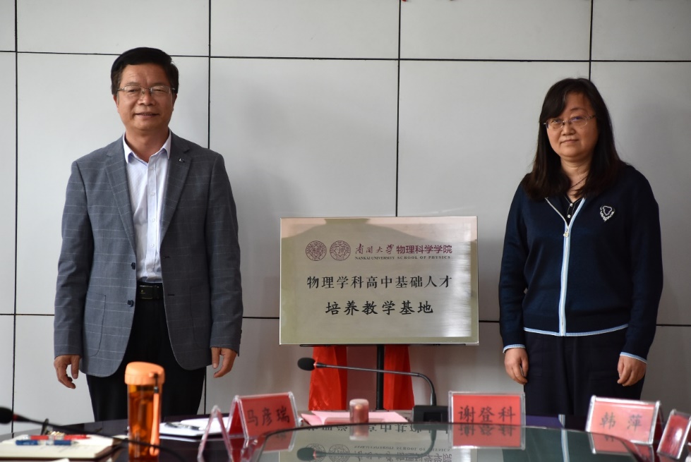 沧州市第一中学党委书记校长于秀娥、副校长吕迎春共同为南开大学物理科学学院共建物理学科高中基础人才培养教学基地进行揭牌