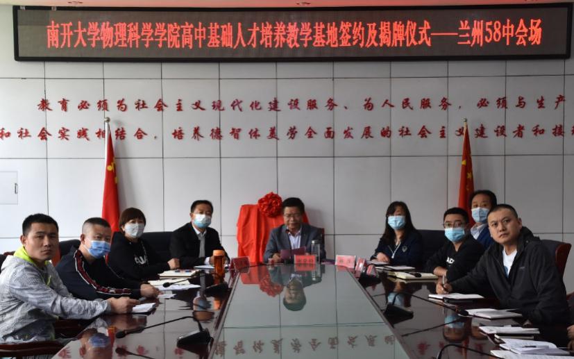 兰州市第五十八中学校长谢登科、副校长韩萍共同为南开大学物理科学学院共建物理学科高中基础人才培养教学基地进行揭牌