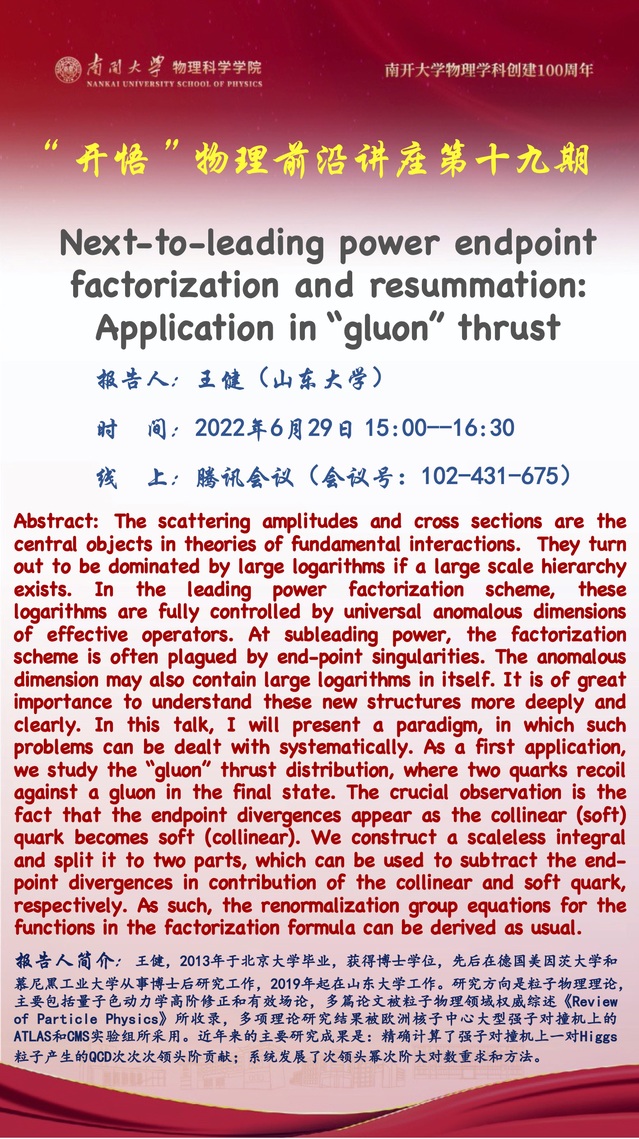 【“开悟”物理前沿讲座(第 19 期)】Next-to-leading power endpoint factorization and resummation: Application in "gluon" thrust