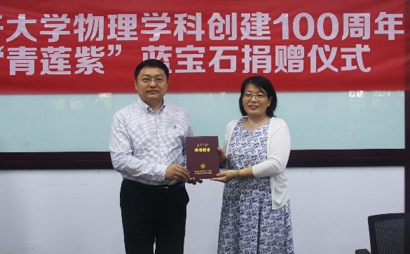 99日,南开大学物理学科创建100周年“青莲紫”蓝宝石捐赠仪式在K体育·(sports)官方网站第三教学楼举办。捐赠方代表、学校发展办、基金会负责人、物理科学学院负责人以及学院师生代表参加了仪式。