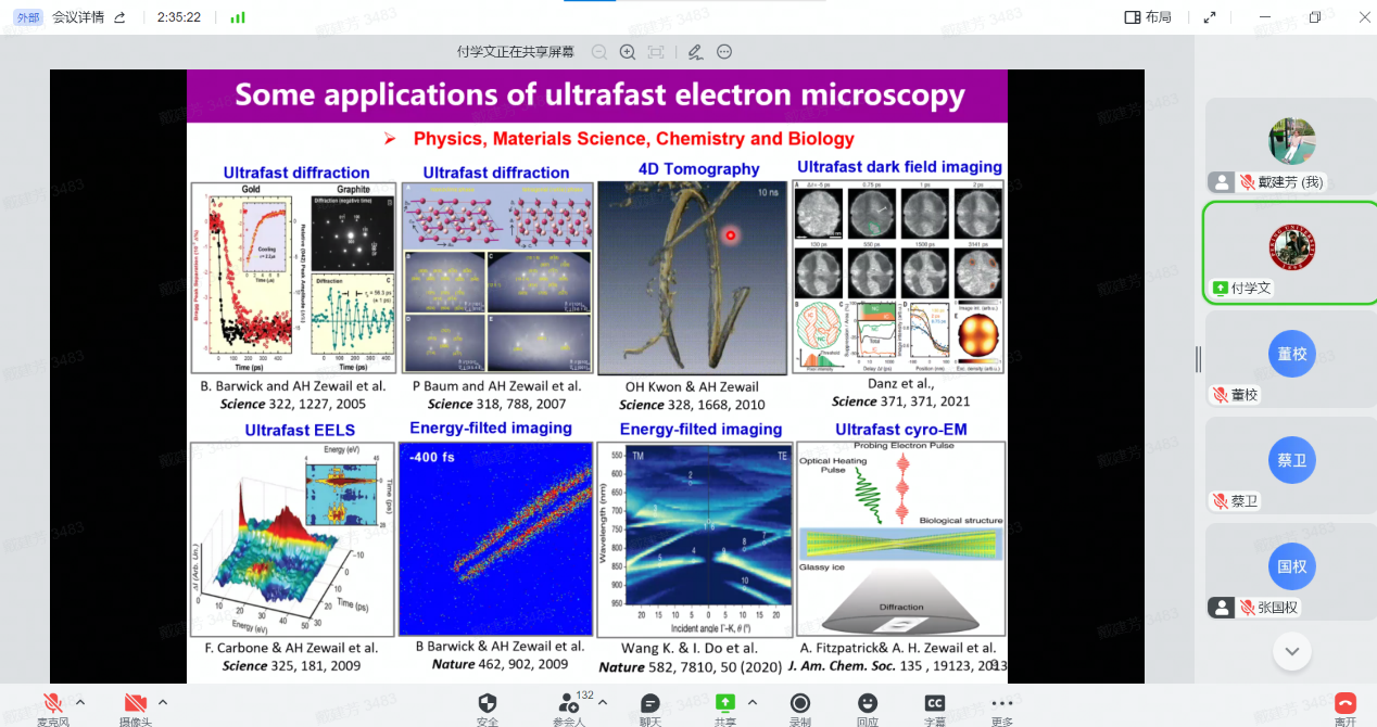 会议上午阶段安排8场主题报告,分享学院在课程思政、学术成果、实验教学等方面取得的突出成绩和最新成果。其中蔡卫、张心正、董校和付学文分别以“中红外石墨烯等离激元近场成像与应用研究”、“非线性光子芯片中的太赫兹波局域的拓扑调控”、“高压下的元素规律”、“基于场发射电子枪新一代4D超快透射电子显微镜的研制及其初步应用”为题汇报了前沿成果,刘玉斌以“课程思政的新理解和新实践”为题结合具体案例,分享了课程思政实践体会与建设思路。张思遥以“声速测量”为题现场示范实验授课。学院新入职教师吴远彬和陈旭东代表青年新生力量,分别介绍了最新研究动态。