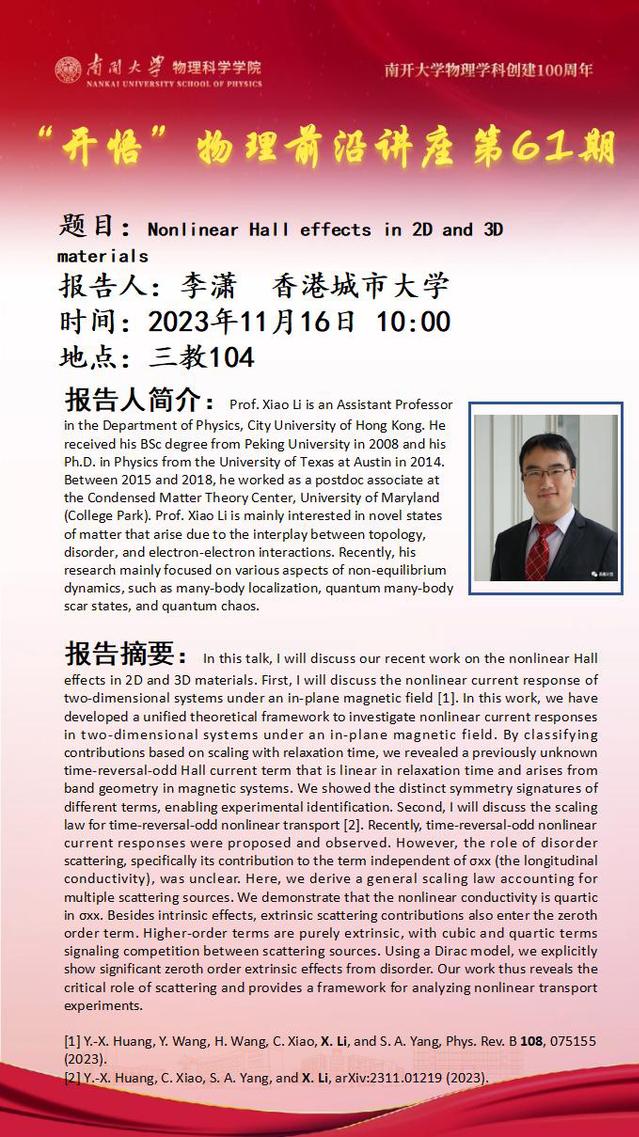 【“开悟”物理前沿讲座(第 61期)】Nonlinear Hall effects in 2D and 3D materials