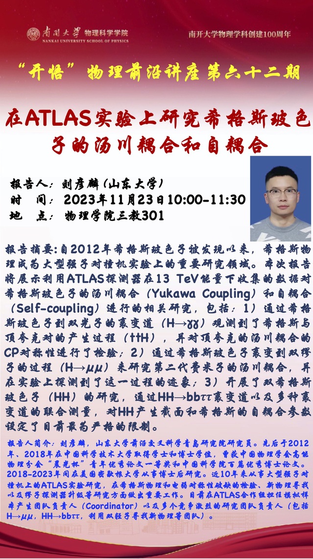【“开悟”物理前沿讲座(第62期)】在ATLAS实验上研究希格斯玻色子的汤川耦合和自耦合