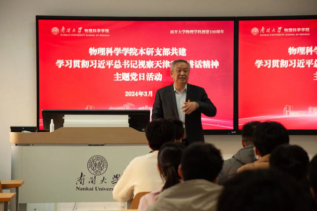 3月14日下午,物理科学学院本科生第一、本科生第二党支部联合博士第一党支部开展共建活动,活动聚焦学习贯彻习近平总书记视察天津重要讲话精神。教育部党组派驻南开大学党建工作联络员汪曣同志出席并给予指导。物理科学学院党委书记唐柏权,党委副书记、副院长韩榕出席了活动。