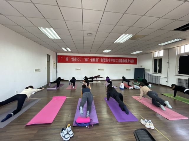 为丰富我院教职工业余生活,增强体质,愉悦身心,提升幸福感,近日,在学校工会的大力支持下,物理科学学院工会“瑜悦身心,伽倍健康”瑜伽健身训练班正式开课。此次培训聘请云水瑜伽专业教练授课,学院教师20余名瑜伽爱好者参加。开班当天学校工会副主席焦艳婷莅临指导,充分肯定了学院工会活动取得的工作成效,高度表扬了我院教工对瑜伽运动的常年坚持,展现了教师们对瑜伽健身的热爱和对运动快乐的追求,鼓励大家积极参与认真训练,用好瑜伽锻炼的平台,示范带动更多的教师加入健身活动,用心打造学院工会特色品牌活动。
