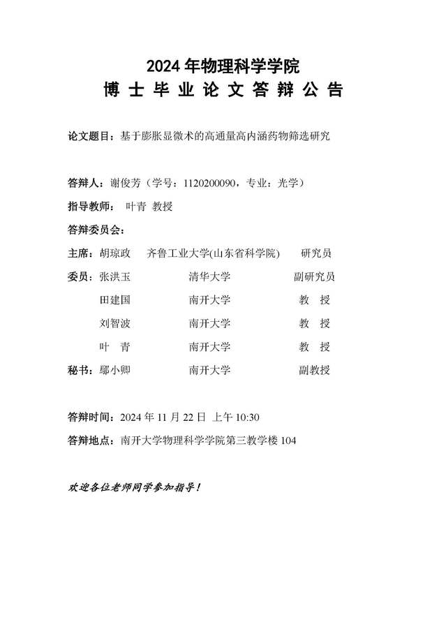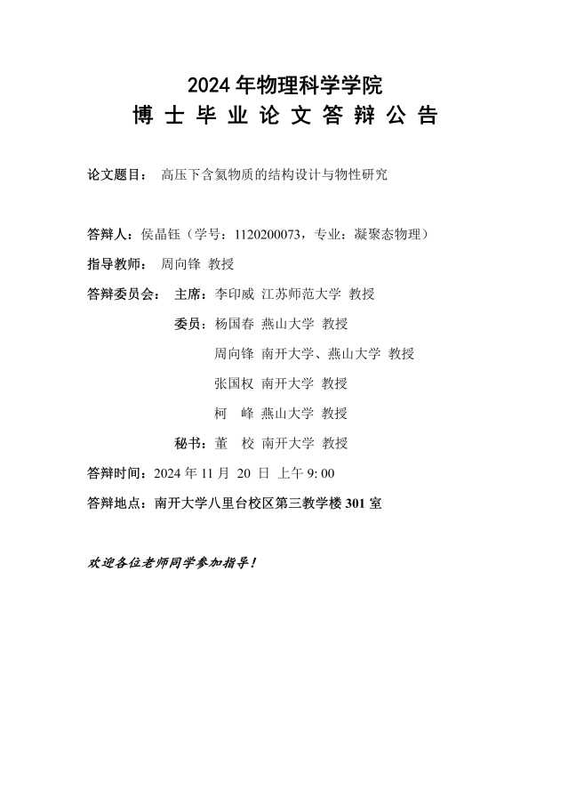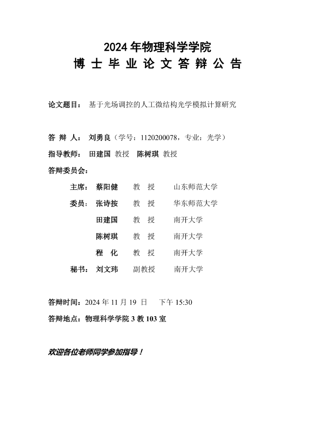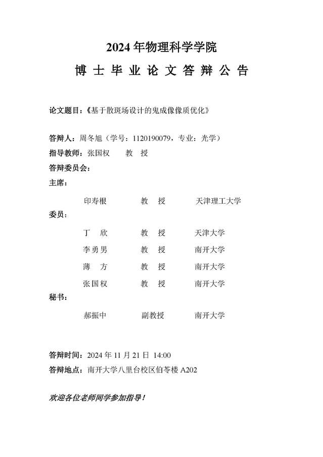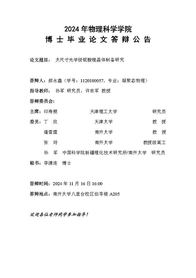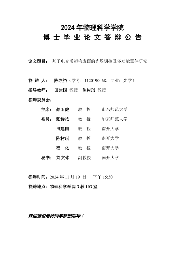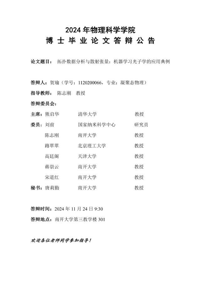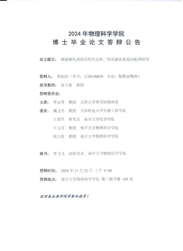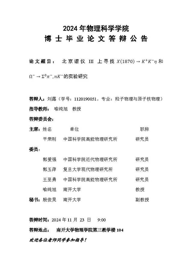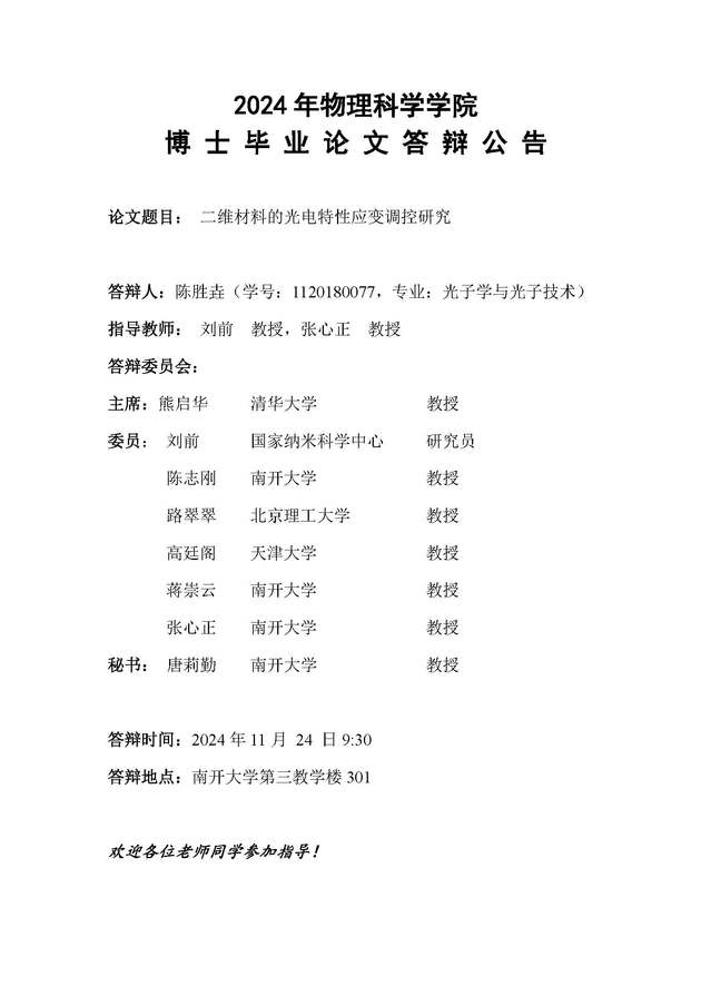 【毕业答辩】2024年秋季学期物理科学学院博士毕业论文答辩公告