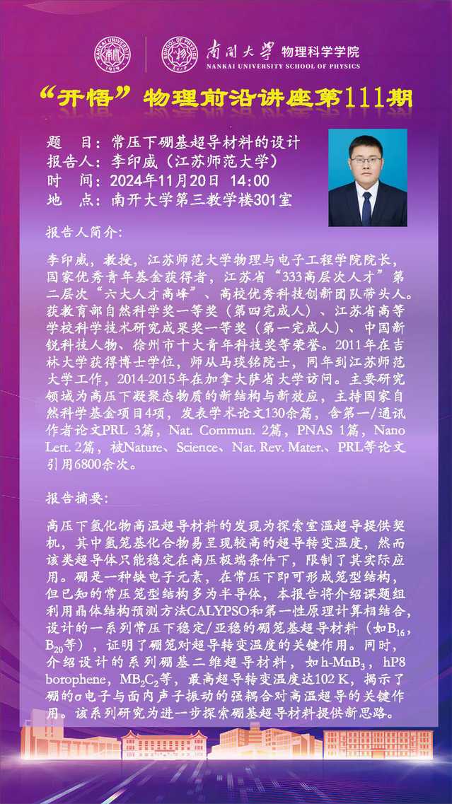 【“开悟”物理前沿讲座 (第111期)】常压下硼基超导材料的设计
