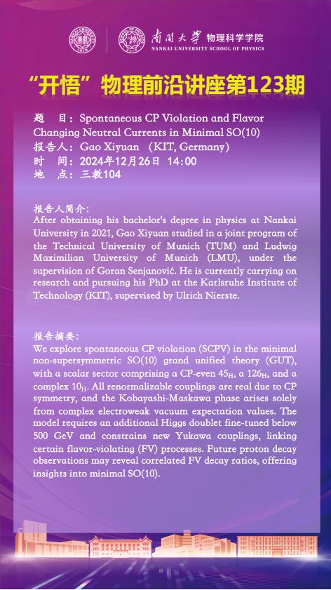 【“开悟”物理前沿讲座 (第123期)】Spontaneous CP Violation and Flavor Changing Neutral Current in Minimal SO(10)