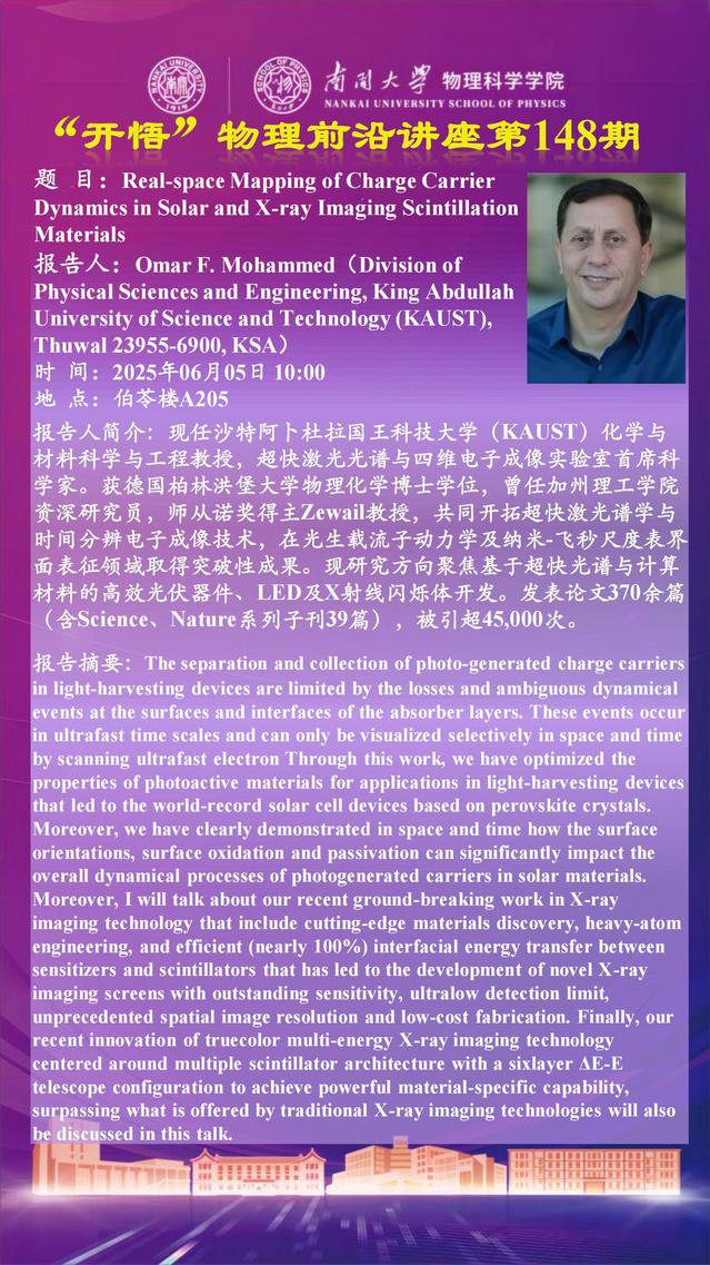 【“开悟”物理前沿讲座 (第148期)】Real-space Mapping of Charge Carrier Dynamics in Solar and X-ray Imaging Scintillation Materials