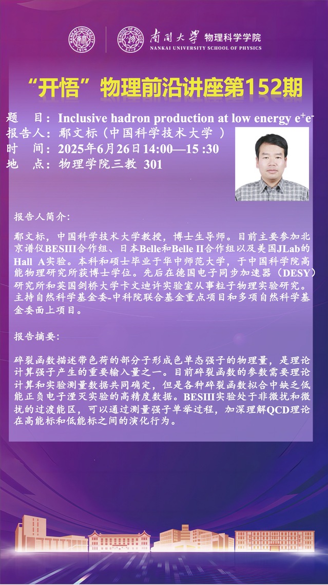 【“开悟”物理前沿讲座 (第152期)】Inclusive hadron production at low evergy e+e-