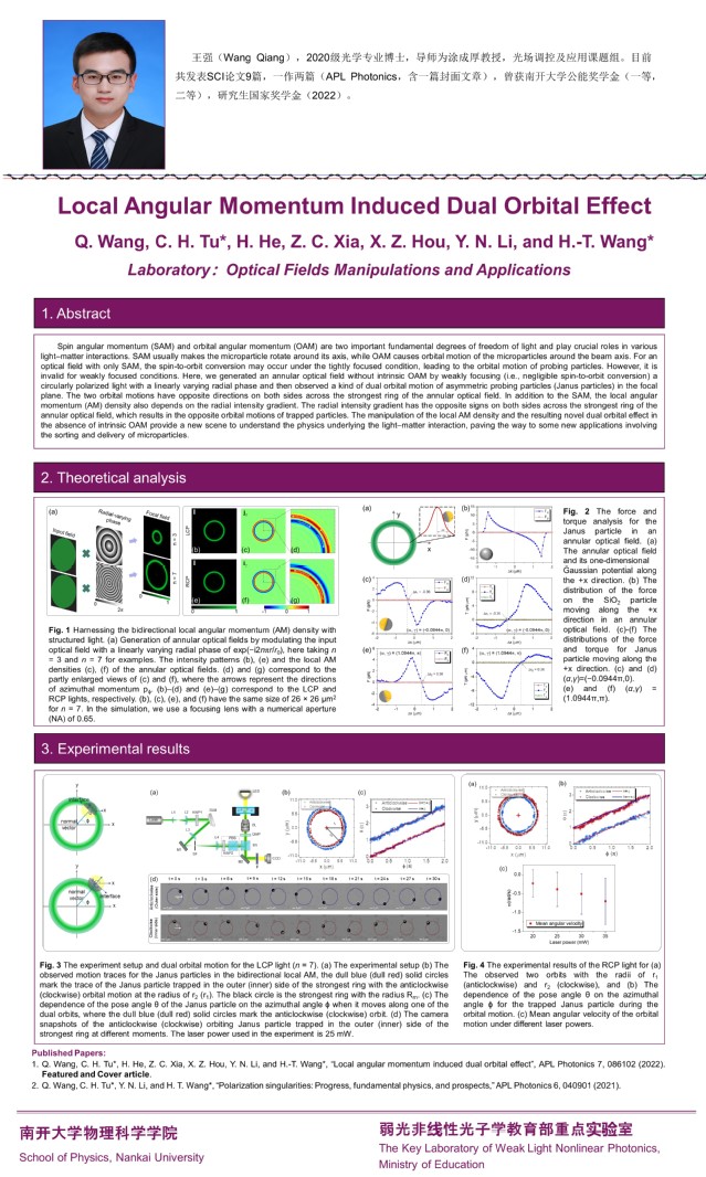 On Dec. 30th, 2022, the 2022 Annual Academic Conference of the School of Physics of Nankai University was held online. The school continued its tradition of collecting posters of graduate students for evaluation, aiming at training graduate students’ abilities to sort out and refine scientific research papers and improving their academic writing abilities. Ten students, Kaixuan Huang, Jiaxin Yang, Lun Qu, Qiang Wang, Yuhui Zhuang, Tengjiao Wang, Tao Wang, Caiyan Zheng, Xu Sang and Zepeng Sun, won the Outstanding Academic Achievement Award through the selection by the school.