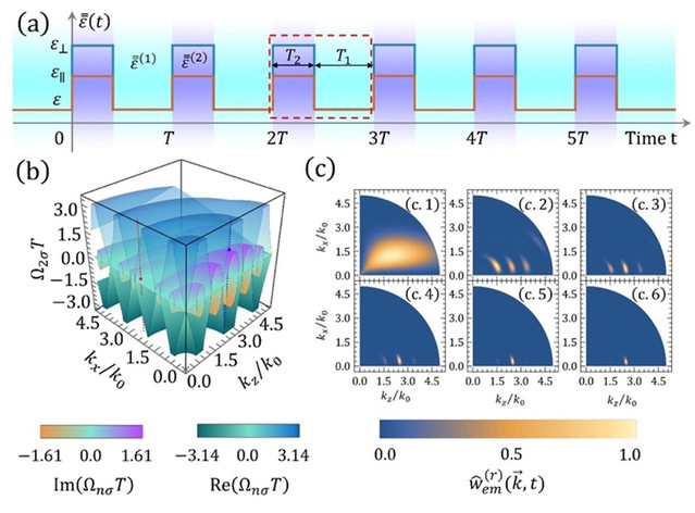 Figure I: (a) Schematic of the APTC; (b) Band structure of the APTC; (c) Normalized radiative energy in momentum space at various time instants of the APTC due to an embedded stationary charge.